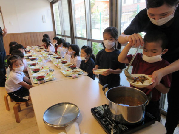 出来上がったカレーは自分たちでお皿に盛って食べました🍛
